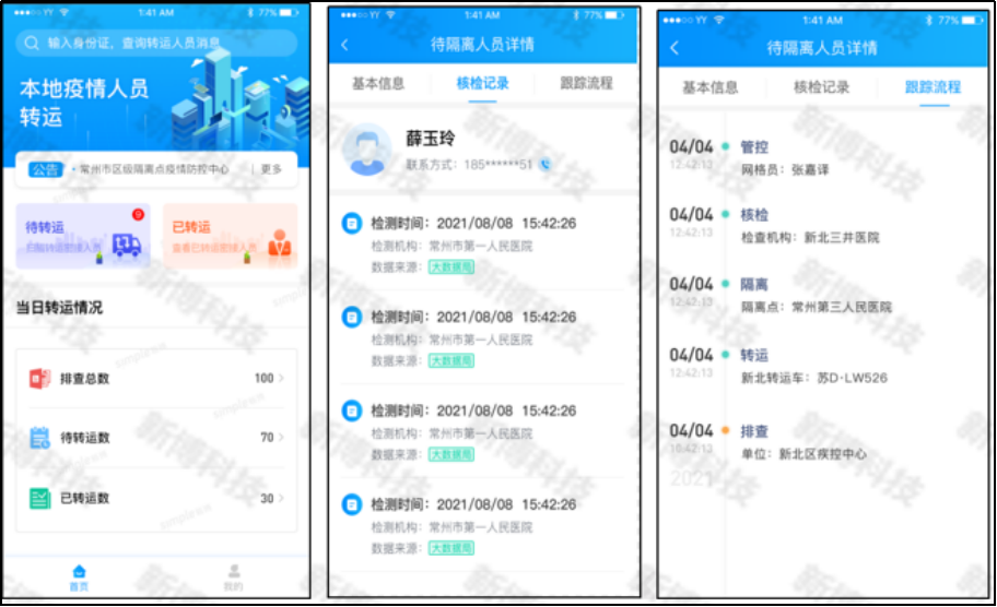 针对本地疫情情况,当转运人员需要对密接人员进行转运时,转运人员可以及时了解到本阶段转运人员情况,包括排查总数、待转运数、已转运数等。方便转运人员清楚了解待隔离人员的基本信息、清晰掌握管控人员数量趋势走向以及核酸检测情况。