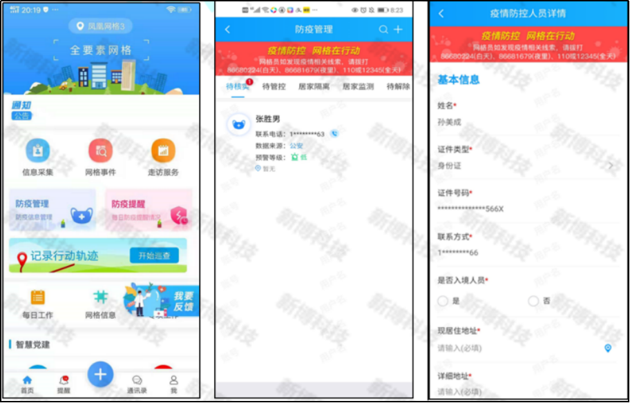 基于网格员版APP,拓展建设“防疫管理”和“防疫提醒”,为落实新冠疫情常态化管控奠定基础。其中防疫管理中提供新增人员、待核实、待管控、居家隔离、居家检测、待隔离、待变更、解除关注、不在常、无法核实等功能。确保网格员在疫情落地管控过程中可以快速便捷的开展一系列工作。