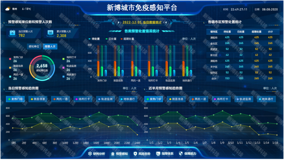 市级防控指挥部依据流调跟踪、区域分析、疫情态势、保障能力等多个维度组建研判分析模型,利用可视化引擎、GIS数据、热力地图等技术实现疫情防控“感知、分析、预警、研判”全程可视化管理,实现疫情防控管理工作科学化、精细化、服务高效化。