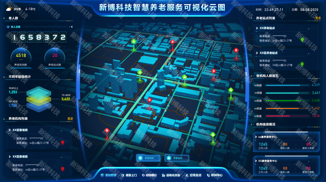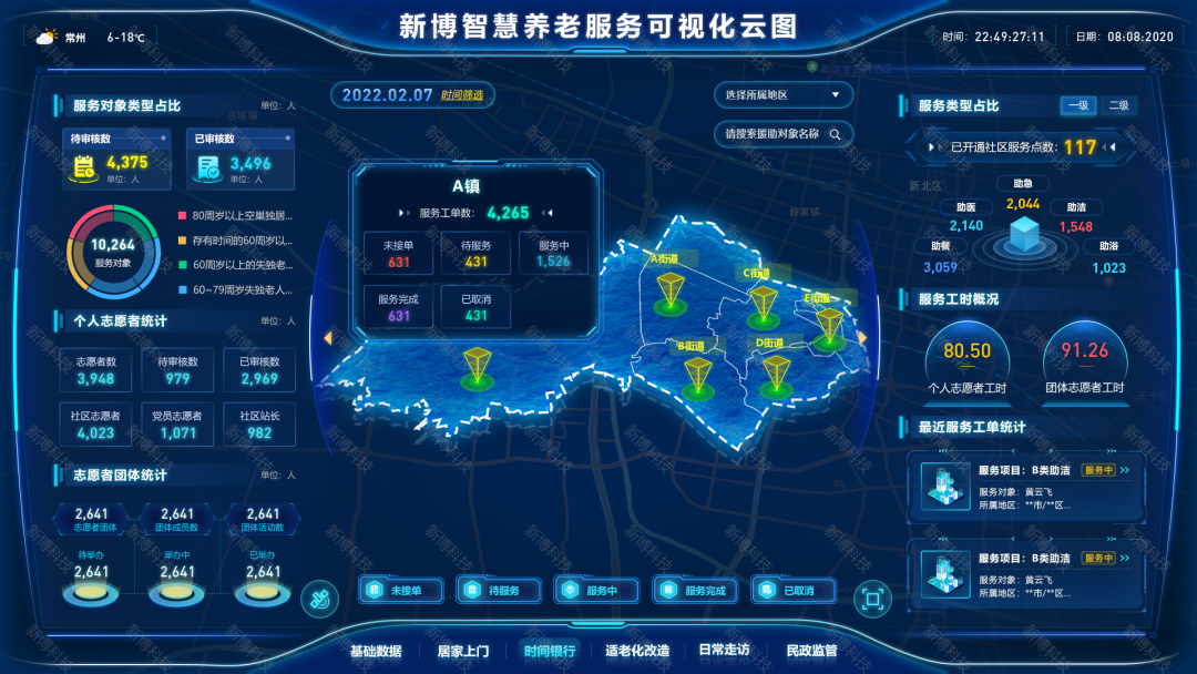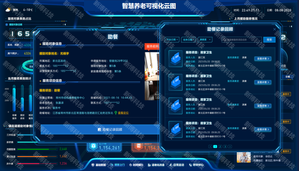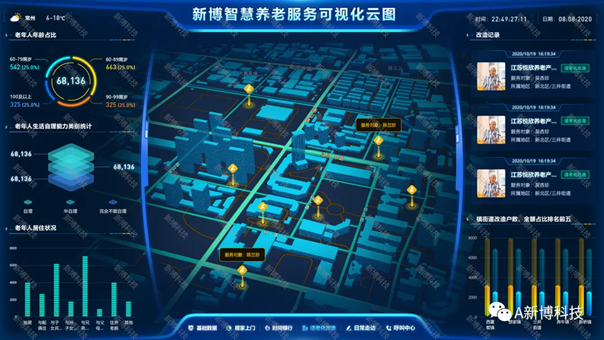 动态汇聚老年人基本信息,集成老年人、居家养老服务、时间银行等GIS地图区域分布,满足远程视频、在线应急指挥要求,形成智能感知、快速反应、精准指挥、科学处置的指挥调试体系。