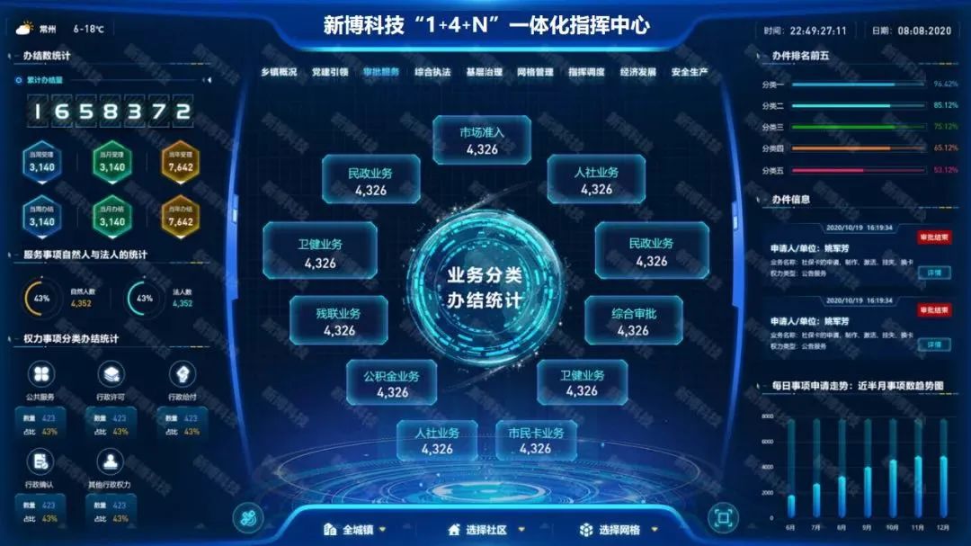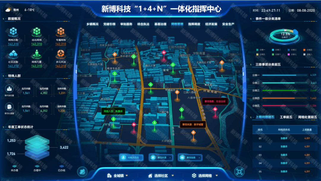 新博科技积极响应,紧跟强镇的一办七局扩权机构改革需求,从智慧镇街综合治理所面临痛点出发,建强处置调度“一个中心”,实现研判分析智能化;健全组织管理“一套机制”,绩效考核高效化;构建社会治理“一张网”,统筹资源一网联动;整合网格力量“一支队伍”,探索网格条线多元化;集成全域GIS分布“一张图”,实现地理信息数字化;集成移动应用“一个终端”,探索服务管理便捷化,形成以“六个一”为抓手,落实基层减负。