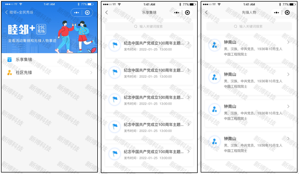 睦领+全民秀场下设乐享集锦和社区先锋两个子模块,社区群众可以在“乐享集锦”板块中查看社区发布的活动,丰富群众社区生活,提高群众参与活动积极性。先锋人物模块包括先进人物介绍,社区工作人员可以上传人物照片、采访视频、宣传文章等,发挥先锋任务的引领作用。