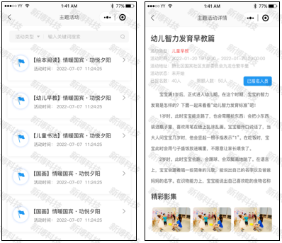 建设主题活动模块,社区工作人员可进行活动的发布,便于群众在小程序查看活动详情,并进行活动报名,为群众参加主题活动提供了入口,提高群众参与活动积极性。