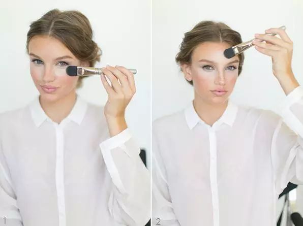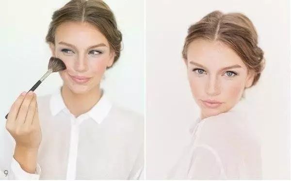 Step2:脸部的T区是提亮的重点,首先我们将修容粉用在脸颊,这样在视觉效果上就能让脸变窄。