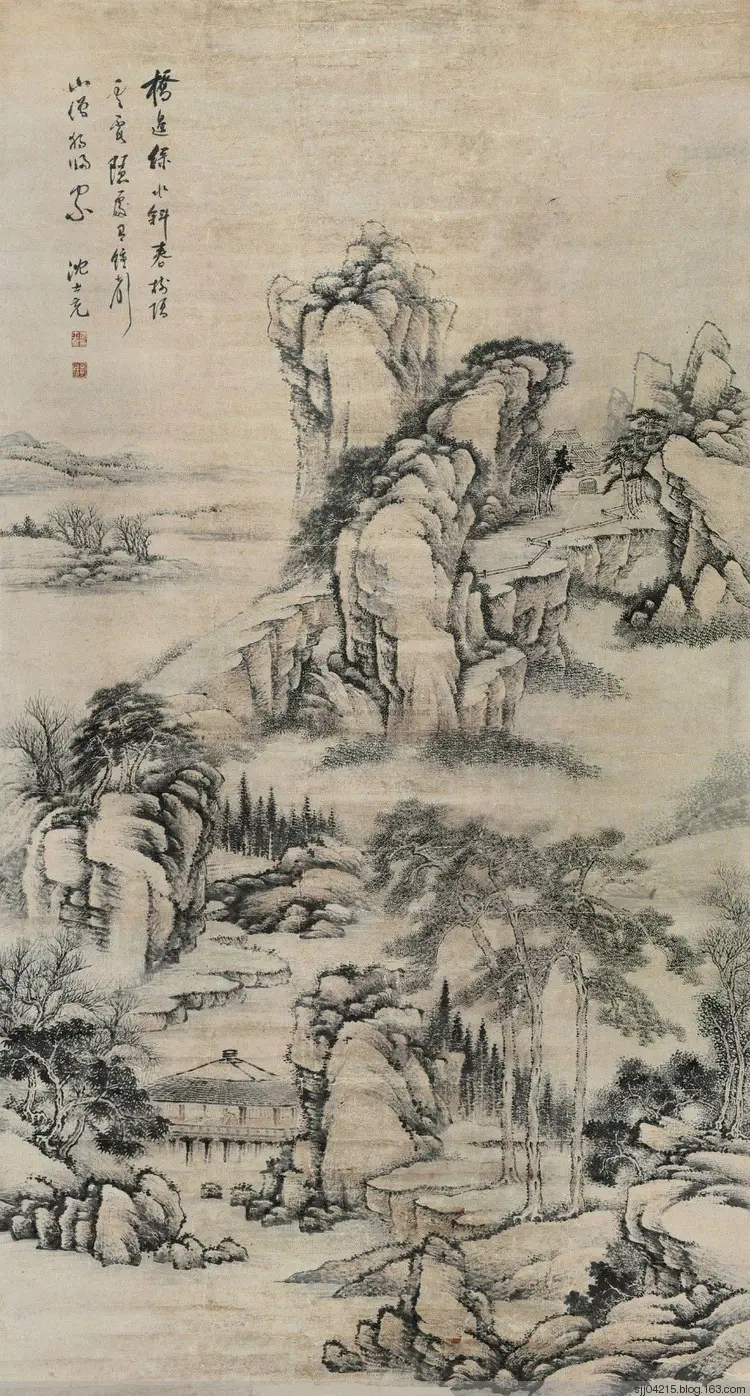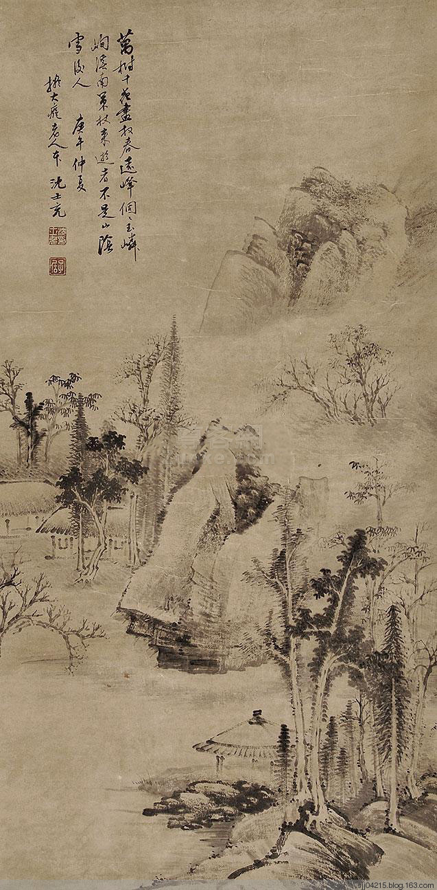 沈士充是明末“松江派”的画家,陈继儒写给他求为董其昌代笔作画的一封信,已成了后世美术史家研究董其昌与松江绘画的重要史料。其实他的画笔,与董其昌判然有别。沈氏长于构图,皴染周至,是技巧纯熟的作家画;董氏用笔生秀,不拘形模,是但称己意的士夫画。有:《仿古山水图》卷及《天香书屋图》轴,现藏故宫博物院;《秋林水阁图》轴,藏南京博物院;《仿黄公望天池石壁图》卷,辑入《沈子居陈眉公书画合壁》单印本。