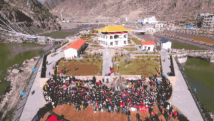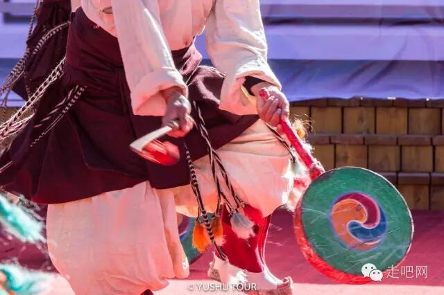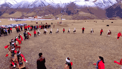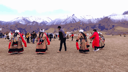 衣着绚烂民族服装的藏民,仅用“悠颤跨腿”、“趋步辗转”、“跨腿踏步蹲”等简单的腿部动作和“撩、甩、晃”的手臂动作,就能舞出欢快的节奏。