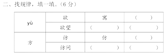 完成此题,需要观察表格,找出题目排列规律,再此基础上组词,最后从自己的字词知识库中找出同一类别的字,尝试自己组词。试题综合考量学生的词语辨析和运用能力。完成试题后,学生也习得了一种分类整理词语的方法,
