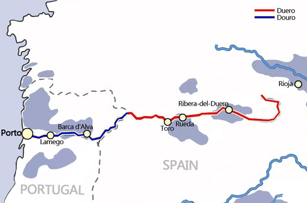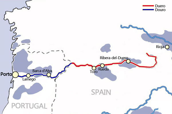 杜埃罗河是杜罗河在西班牙的名称,该河的大半流程是在西班牙境内。途经的主要葡萄酒产区为Ribera del