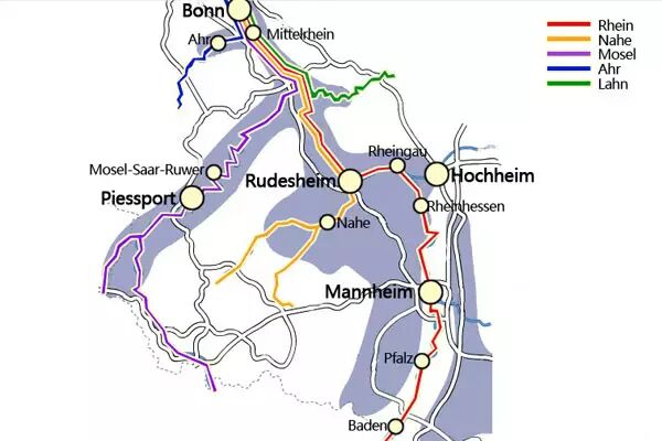 产区中有3个的名字取自莱茵河--Rheinhessen、Pfalz(早前称为Rheinpfalz)和狭小的Mittelrhein地区,由此可见莱