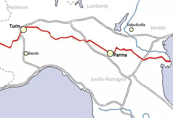 Romagna。波河最后在威尼托三角洲汇入亚得里亚海,威尼托是各种不同类型葡萄酒的大杂烩,其中最耳熟能详的DOC/DOCG是Bardolino、