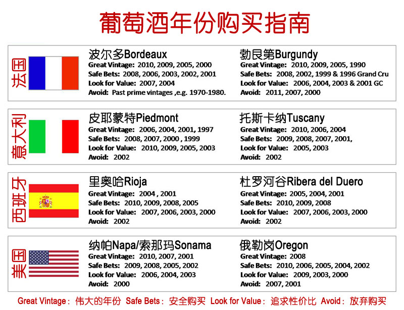 槟和阿尔萨斯来说,2005年则只是个普通的年份。同样,对于波尔多来说,2004年是个不好的年份,而对于意大利的巴罗洛来说则是一个伟大的年份。