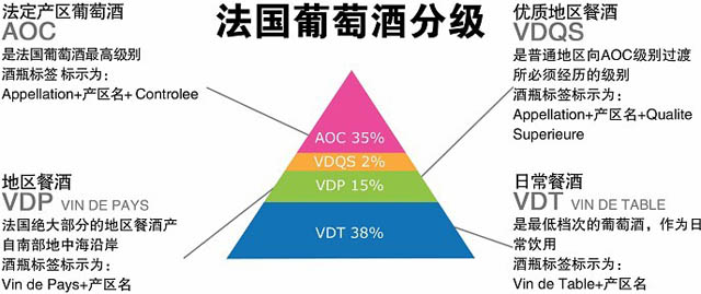 大体而言,法国葡萄酒按葡萄酒品质的优劣共分为4级,由高到低为AOC、VDQS、VDP和VDT。其中,VDQS已于2011年底废除。具体等级表示的含义请看下图。