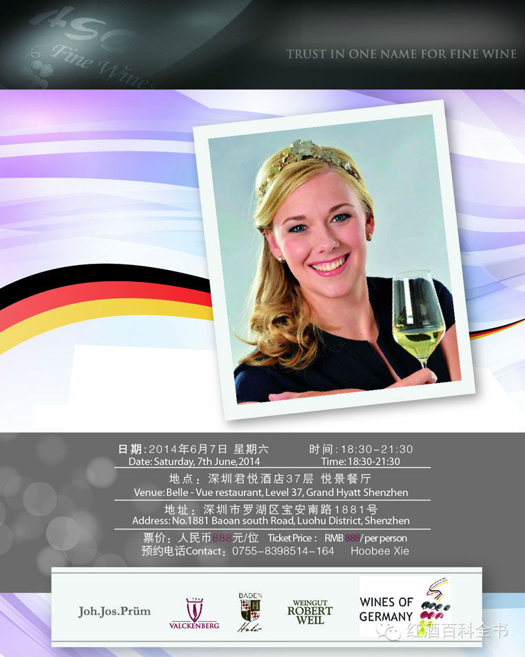ASC 为本次活动精选多款德国美酒,分别代表来自不同产区的佳酿特质:源自莱茵黑森的沃克堡酒庄(Weingut P.J. Valckenberg)以严格控制产量和全手工采摘葡萄的方式,确保其所酿制的高质量葡萄酒鲜明体现酒庄特色;独具莫索特色的普朗酒庄(Weingut Joh. Jos. Prüm)是德国最具传奇色彩的酒庄之一,其所出产的雷司令品质非凡,酸度与果味完美平衡,是全世界葡萄酒爱好者们竞相收藏的目标;堪称莱茵高翘楚的罗伯 特威尔酒庄(Weingut Robert Weil)凭借其“城堡品质”获得国际葡萄酒观察家的广泛认可,是德国公认的雷司令文化象征;而来自巴登产区的雨博酒庄(Weingut Bernhard Huber)则以出色的陈酿能力而著称,其产自老年份葡萄藤的黑皮诺堪称巴登地区的上乘极品之一。本次活动中,ASC将隆重邀请德国葡萄酒公主瓦格纳小姐 为大家介绍德国的葡萄酒文化知识,并带领中国的美酒爱好者们通过品鉴四个酒庄最具代表性的酒款,感受德国不同产区葡萄酒的丰富魅力。