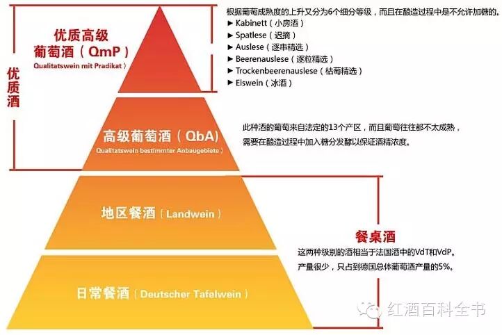 要想判断一瓶德国葡萄酒的品质和价格,就必须了解葡萄酒品质的分级。以下为德国葡萄酒分级图。