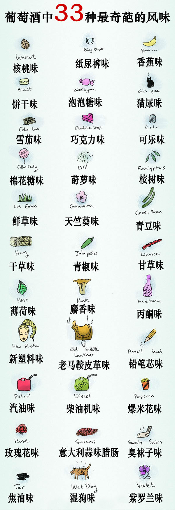 每当品酒会上,总会看见不少人端着葡萄酒,深吸一口气,闭上眼睛,嘴巴里慢慢地突出:“浓郁的花香、果香,带有淡淡的橡木桶味……”看似很牛B,不过红酒百科全书(微信号:wikiwine)要告诉你的是,一款葡萄酒,如果只有花香、果香和橡木香也算不上什么令人惊奇的好酒。葡萄酒还有很多奇葩的风味,看看以下33种,你曾遇到过哪些?