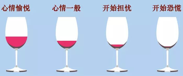 当杯中有标准量的葡萄酒时,葡萄酒专家会保持乐观的心态,当杯中的葡萄酒越来越少时,他会心情也由晴转阴,越来越恐慌,越来越恐慌,越来越……