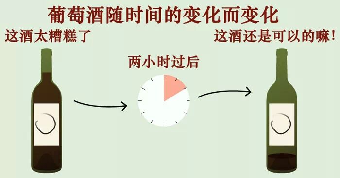 刚打开一瓶葡萄酒,觉得正差劲,两小时过后,这瓶葡萄酒还是可以喝的,所以,葡萄酒专家要经得起两个小时的等待,在这两个小时,确实是种煎熬呀。