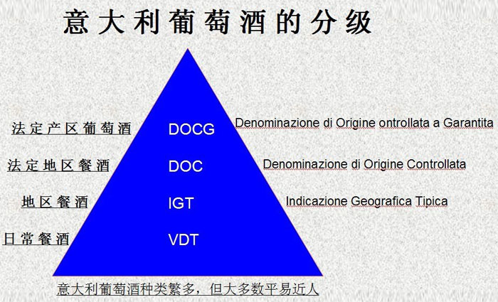 10、意大利的葡萄酒分级:意大利葡萄酒共分为4级,按高到低分别为:DOCG、DOC、IGT和VDT。