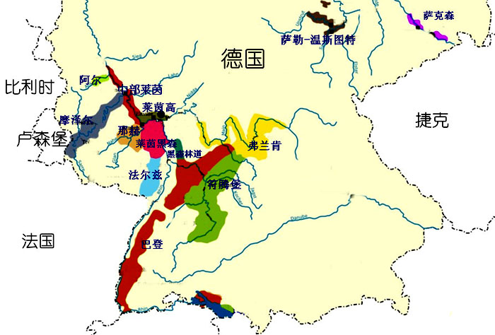 3、德国可分成13个葡萄酒产区,其中莱茵黑森(Rheinhessen)是德国最大的葡萄酒产区,莫泽尔(Mosel)和莱茵高(Rheingau)是生产品质优异的葡萄酒的两大知名产区。