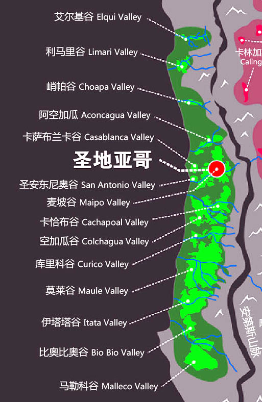 智 利中部地区包括阿空加瓜(Aconcagua)、卡萨布兰卡(Casablanca)、圣安东尼奥(San