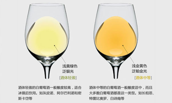 大多数白葡萄酒酒体适中,呈淡淡的金黄色,比如长相思(Sauvignon Blanc)、未经橡木桶陈酿的霞多丽和白诗南(Chenin Blanc)。