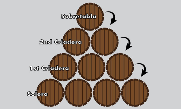 雪莉酒(Sherry)是西班牙最重要的葡萄 酒之一,出产于西班牙安达卢西亚省的小镇赫雷斯、桑卢卡和圣玛利亚港地区。雪莉酒采用索雷拉系统来进行陈年,当年酿造的新雪莉酒会被加入被称为 “Sobretabla”的最上层木桶中(最低为3层,最高可达14层),而用于装瓶的雪莉酒则是从底层的木桶中取出,当最底层的葡萄酒被装瓶后,就用其 上一层酒桶(1st Criadera)中的葡萄酒将其注满,上一层酒桶的位置则被上上层酒桶(2nd Criadera)中的葡萄酒所取代,依次类推。由于最底层的酒桶从来不会抽取超过1/3的酒液,所以到最后每层酒桶中的葡萄酒都含有不同年份的葡萄酒, 因此通过索雷拉系统陈年的雪莉酒都没有具体的年份。