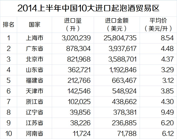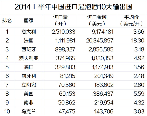 2014年上半年,我国进口起泡酒总量为5,653,921升,同比上涨45.2%;进口总额为37,030,653美元,同比上涨39.8%;平均价格为6.55美元/升,同比下跌3.7%。