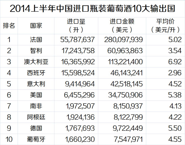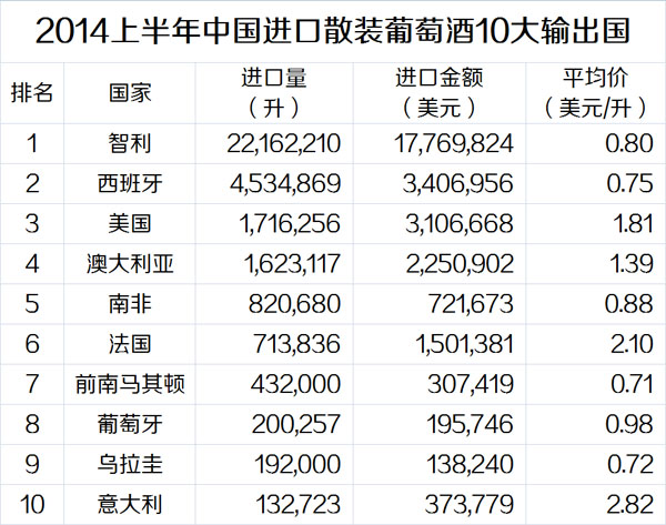 利亚取代法国成为这10大输出国中的领先者。此外,2013年上半年,智利在瓶装进口葡萄酒总量方面位于第4,而2014年上半年则跃居第2,这表明智利