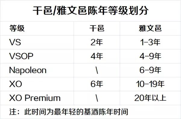 以上仅为最年轻的基酒最短陈年时间的规定,当干邑和雅文邑品质越好时,其基酒陈年时间远远超过上述陈年时间。