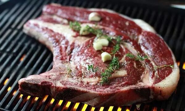 4、T-Bone(T骨牛排):呈T字型,是牛背上的脊骨肉。T型两侧一边量多一边量少,量多的是肉眼,量稍小的便是菲力。