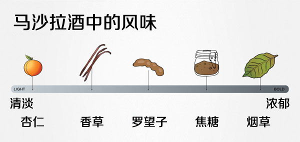 马沙拉酒最常见的风味有香草、焦糖、炖杏和罗望子的风味。马沙拉酒从干型到甜型都有,侍酒温度一般为12度。如果你有幸尝到一款高端的马沙拉酒,你将从中找到更多的风味,包括莫利洛黑樱桃、苹果、蜂蜜、烟草、核桃和甘草的风味。