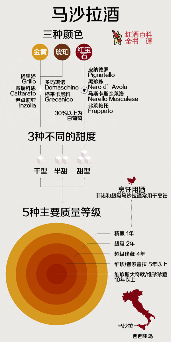 1、马沙拉酒是用意大利西西里岛本地葡萄酿制,随后用白兰地或者无味的葡萄烈酒进行加强。