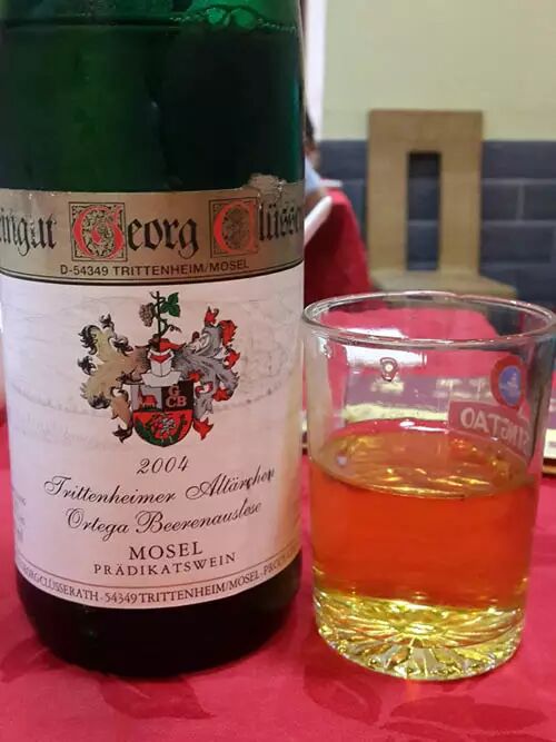 再 闻闻这个酒,哇,满满的蜂蜜味和葡萄干味随之而来!再一喝,咋这么甜。咦?咋有点像贵腐酒的感觉,不是说了拿晚摘Spatlese的吗?再仔细一看,原来 是逐粒精选酒(Beerenauslese,以下简称BA)。坑老板啊,把桌上最贵的一瓶德国葡萄酒给拿出来了,这下回去要挨骂了……