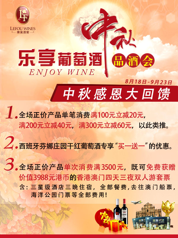 金秋佳节将至,随着乐富酒窖徐闻店一周年志庆,粤西区加盟店“中秋酒会•乐享葡萄酒”金秋活动即将火热进行,乐富酒业诚意邀请您亲临现场,与乐富酒窖共话杯酒人生!