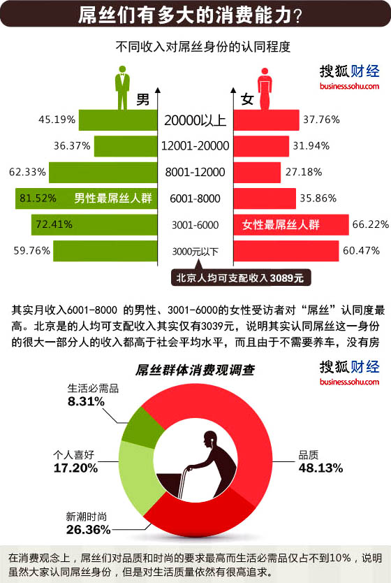 3039元人民币,这表明,大多数自称为吊丝的人实际上收入都高于社会平均水平。此外,吊丝最看重的是品质和时尚的生活,对生活必需品需求并不大。由于有