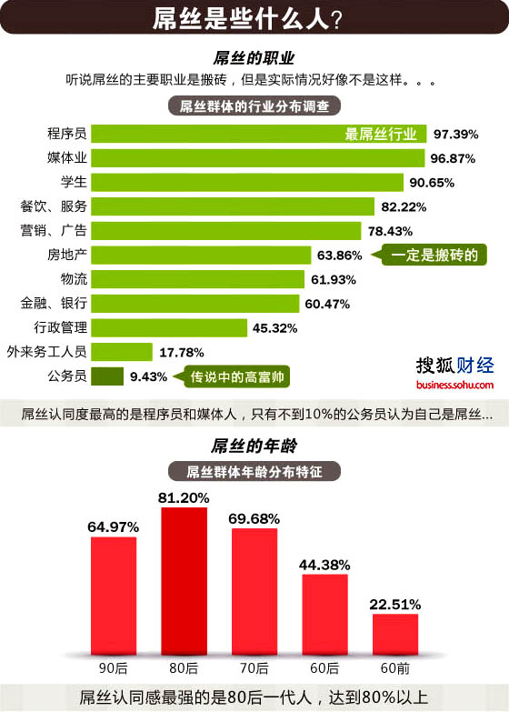 图为搜狐财经绘制的吊丝信息图,从图中可以看出,“程序猿”和媒体从业者中的大部分人称自己为吊丝,而仅有不到10%的公务员自称吊丝。此外,在吊丝年龄