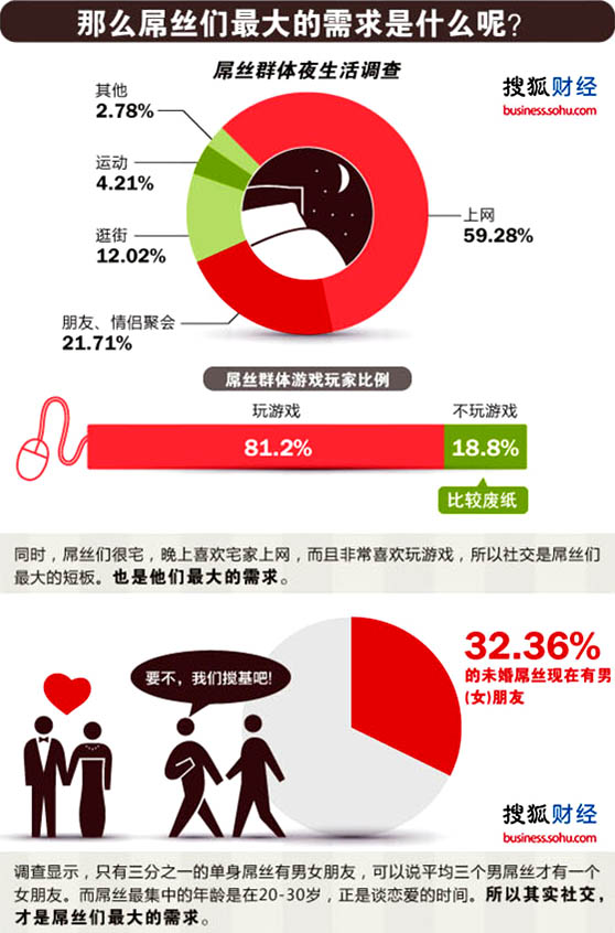 上图可以看出,吊丝们最显著的一大特点就是宅,于是社交成为其最大的短板,当然也成为了最大的需求。丰富的社交活动不仅能够表现自身的社会地位,而且有助