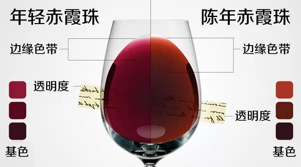 陈年的黑皮诺葡萄酒的砖红色变得更深,而陈年越久,颜色会转变为橘色和棕色,其边缘色较浅,边缘色带较宽。(朱颜 译/红酒百科全书,文/WineFolly)