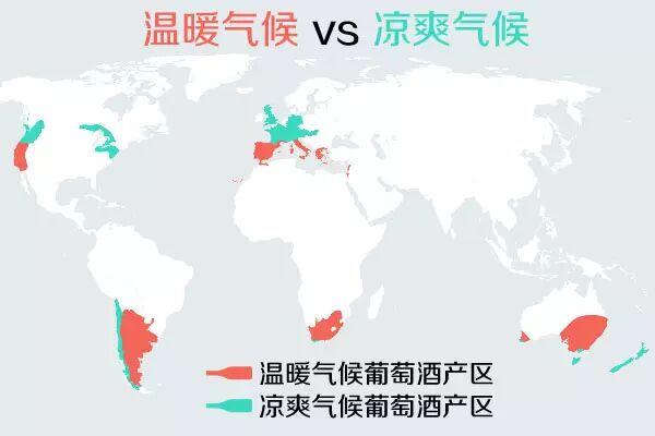 从上图可以看出,全球适合葡萄种植的气候区域广阔,这就导致形成了不同口感的葡萄酒。在这些产区中,主要分为两种气候类型,即温暖气候和凉爽气候。要想挑选符合自己口味的葡萄酒,了解这两种气候的特征是必要的步骤,下面就让我们一起来看看。