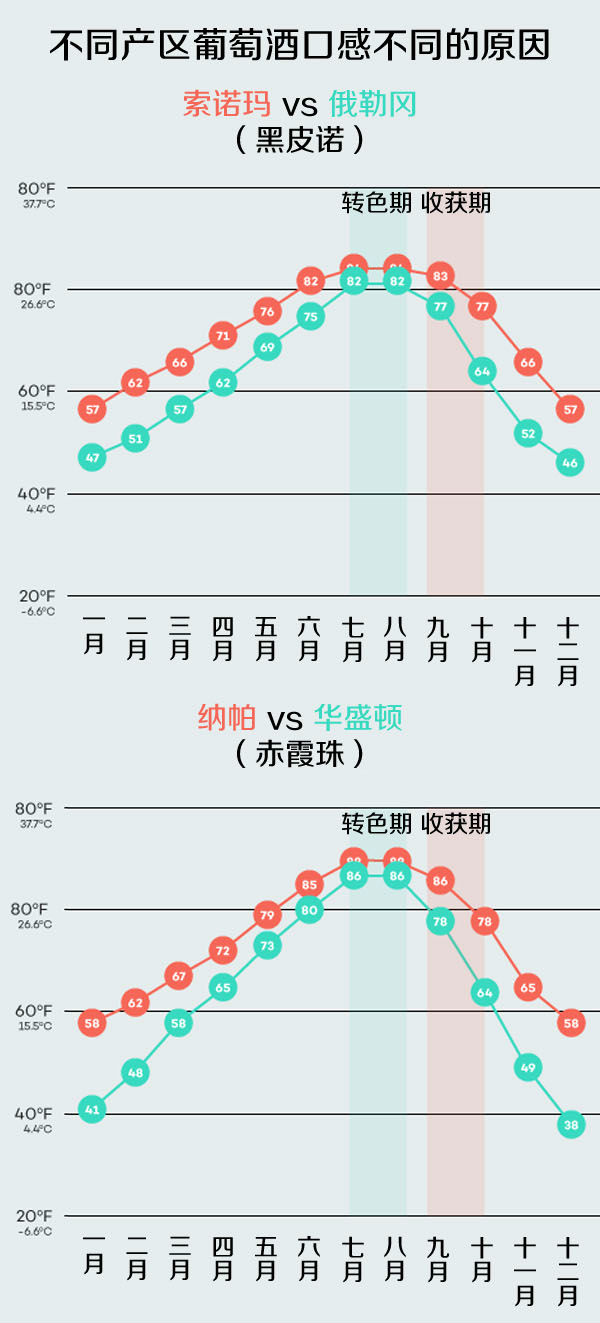凉爽气候产区的温度跟温暖气候产区差不多,但邻近收获期的时候,温度会下降得很快,以致葡萄的味道出现差异。较低的温度能保持葡萄中的酸度,但也会让葡萄难以成熟。所以,凉爽气候产区的葡萄酒酸性果味更浓厚,酸度更高。