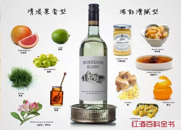 清淡果香型:这是波尔多最常见的白葡萄酒了,常带有柑橘、西柚、柠檬、醋栗和酸橙的气味,还伴有青草、泥土、蜂蜜、百香果和金银花的味道。