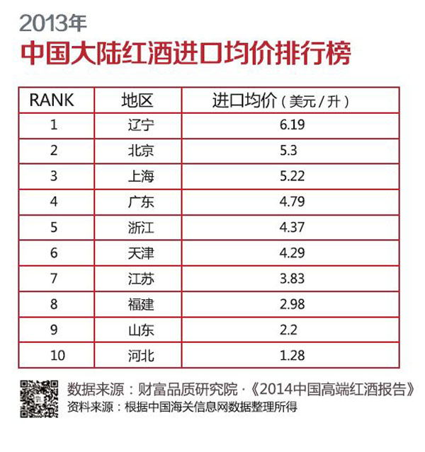 长3%;进口额为56,735万美元,同比增长5%,进口量与进口额分别是排名第二的广东的1.7倍和1.8倍。上海进口红酒均价也较高,2013年进口