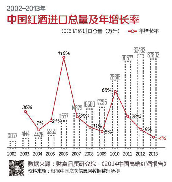 看,2013年中国从旧世界进口红酒量为21400万升,较2012年下跌15.6%;而从新世界进口红酒量为15263万升,较2012年上涨18%。