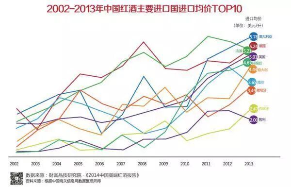 进口均价来看,2013年中国从澳大利亚进口红酒的均价高达5.78美元/升,跃居各国之首。其他新世界国家,如美国(进口均价5.01美元/升)和阿根