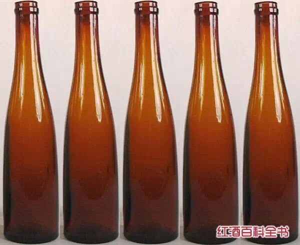 (6)莱茵瓶:莱茵瓶瓶颈细长,形状与摩泽尔/阿尔萨斯瓶类似。唯一不同是莱茵瓶呈棕色。