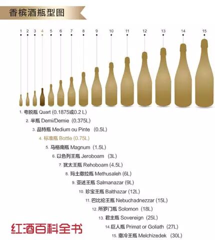 除了标准的750ml瓶外,还有从0.1875L到30L不等的酒瓶,下图以香槟瓶为例,列举出各种不同容量的酒瓶。细心的人会发现一个特点:大部分酒瓶都是以一些知名国王的名字而命名。
