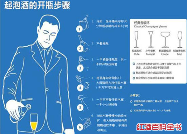 香槟的开瓶与起泡酒一样,不过要切记按住瓶口,以防橡木塞弹出来。具体步骤请参考下图:
