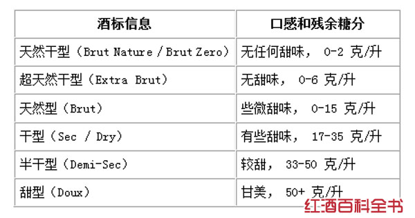 香槟的酒瓶上会标注出代表甜度的信息,参考下表,你就能知晓了。