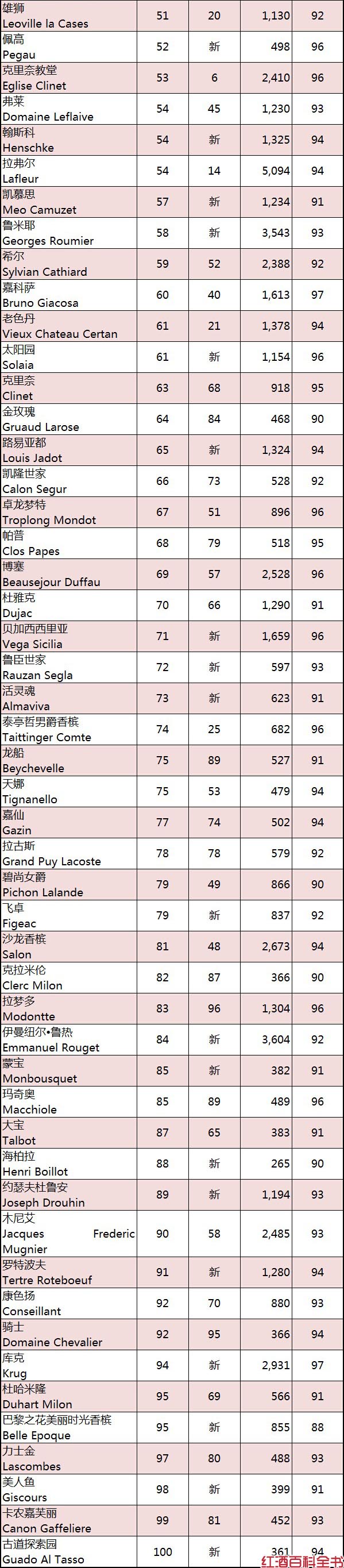 3、今年新晋品牌比较多,排名最前的是意大利嘉雅(Gaja),位居14。紧随其后的是美国加州的作品一号(Opus