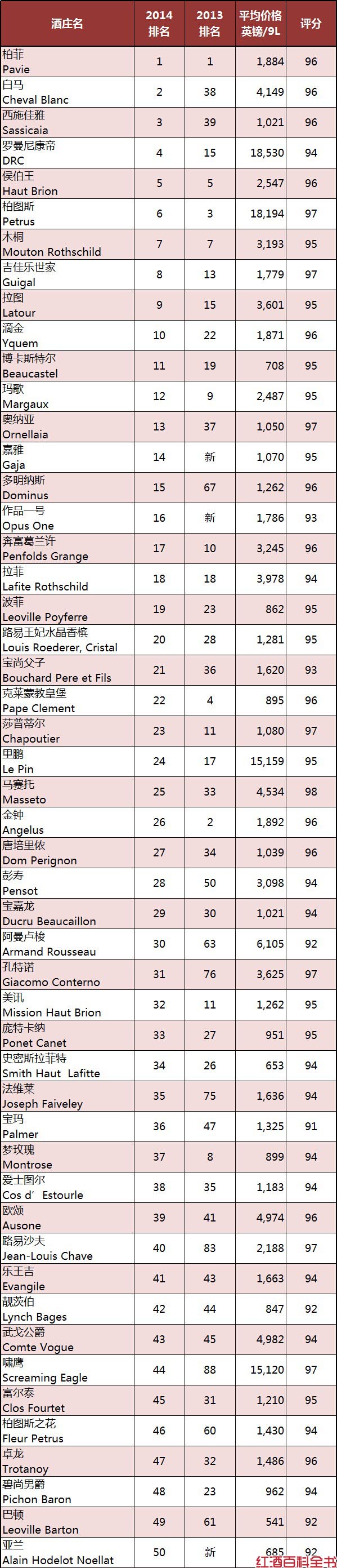 以下是2014年世界百强葡萄酒品牌排行榜,其中排行榜中的价格为平均价格,单位为英镑(£),并以箱计算(12瓶×750ml/瓶)。